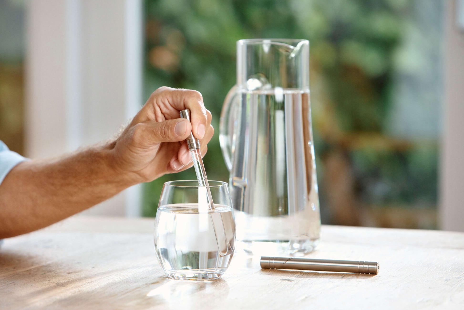 Laget av en enkelt blokk rustfritt stål og kvarts i laboratoriekvalitet, er staven slitesterk, reiseklar og krever verken filtre eller strøm. Bare svirvl den gjennom et glass vann – eller en hvilken som helst drikk som inneholder vann – for å få den til å fungere.